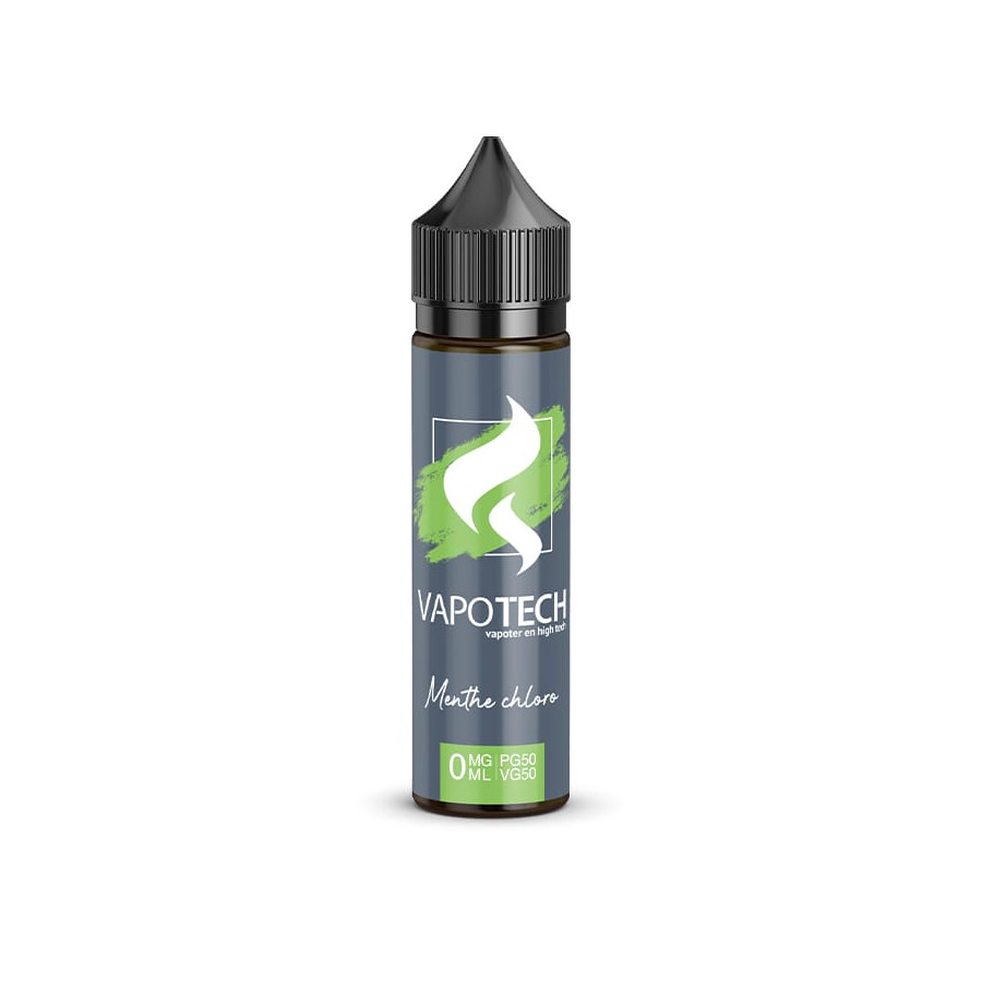 Vendu à l’unité. Flacon de 70 ml contenant 50 ml d’e-liquide Menthe Chloro – Vapotech, base PG/VG 50/50, sans nicotine (0 mg), flacon PET avec embout fin et sécurité enfant.